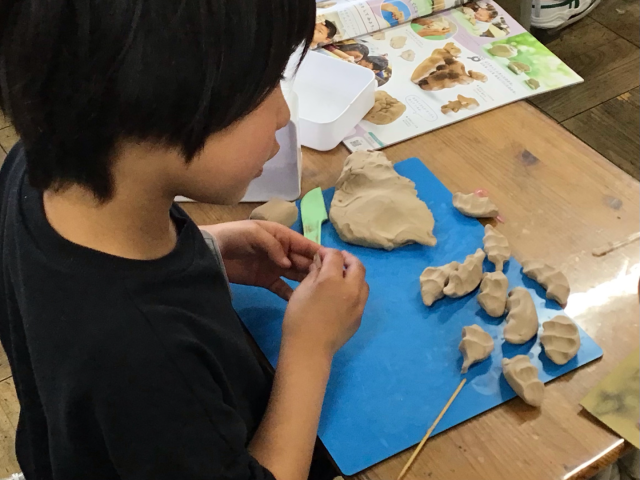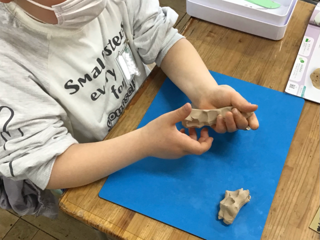 図工の時間、手や指を使い、粘土をにぎってみました。にぎったまま、手を広げると、いろいろな形ができあがりました。そのにぎってできた形を見ながら、何に見えるかを考えました。食べ物や生き物など、さまざまなものに見立てることができました。