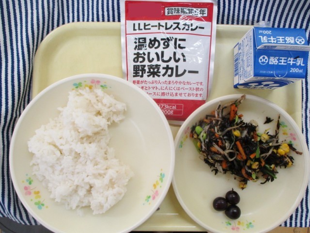 今日の給食は防災食給食「ごはん・牛乳・防災用レトルトカレー・ひじきサラダ・ぶどう」です。