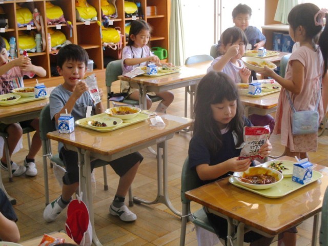 児童のみなさんも「あ、服にはねた!」「カレーがゆかにおちちゃった」「おみせのカレーっぽいにおいがするね」「カレーはからい…?」「けっこうおいしいかも」「残したカレーはどうしよう…」などなど、楽しく食べながらも様々な予行練習をしていたようでした。