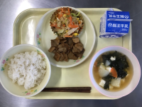 今日はお正月の献立で「麦ごはん・牛乳・青のり小魚(田作り)・紅白なます・いりどり(お煮しめ)」でした。