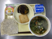 今日は「ドックパン・牛乳・フルーツクリームあえ・ひき肉団子のスープ・紫芋チップス」でした。