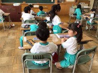 他にも、みどりのきょうだいの時間に5年生を中心にして、6年生へのメッセージカードを書きました。縦割り清掃やみどりのきょうだいで遊んだことを思い出して、1年生も思い思いにメッセージを書いていました。