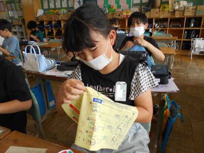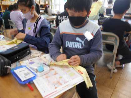 家庭科の時間、教科書のQRコードを読み取り、映像を見ながら、玉結びと玉どめに挑戦しています。糸の長さや針の持ち方などにも気をつけています。「やっとできた!」「はじめてできた!」とできる喜びを味わい、意欲的に取り組んでいます。