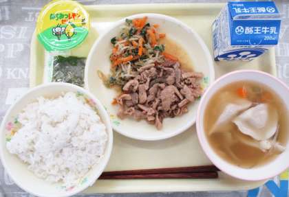 今日の給食は「麦ごはん・牛乳・ビビンパの具(豚肉の甘辛煮・ナムル・のり)・水餃子・はちみつレモンゼリー」です。