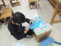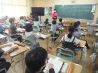 外国語活動では、「How are you?」を使って、気分や体調を聞き合う学習をしました。英語指導助手と一緒に練習をしてから、友だちとペアになってゲームを行いました。友だちに聞かれると、「I'm happy.」「I'm great.」など元気に答えることができました。