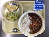 むぎごはん、牛乳、生揚げの肉味噌煮、豆味噌、のり和え