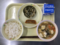 むぎごはん、牛乳、ジャジャンどうふ、蒸しギョーザ、すき昆布の香味和え