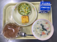 チョコチップパン、牛乳、冬野菜のクリーム煮、ベーコンエッグ、野菜サラダ