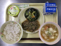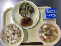 鶏ごぼうごはん、牛乳、焼いて牛肉コロッケ、ほうれんそうのゴマ和え、石狩汁