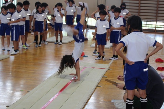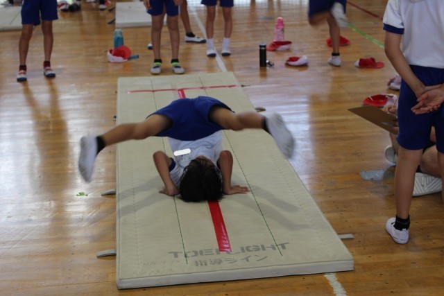 体育科の時間にマット運動に挑戦しています。前転や後転ができるようになったら、開脚前転や開脚後転にチャレンジしています。他にも、補助倒立ブリッジ、側方倒立回転、壁倒立、頭倒立、側方倒立回転の発展技であるロンダードにチャレンジしている子もいます。マット運動や鉄棒運動、跳び箱運動などの器械運動は、低学年から、逆さ感覚を身に付けられるよう積み重ねていくことが大切です。