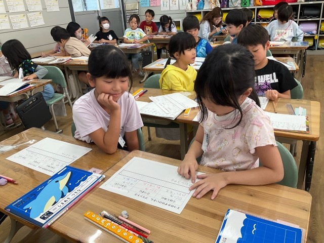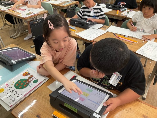 算数の時間に3つの数の計算を学習しました。動画で問題場面を見て、どんな計算になるかを考えました。まずは自分で考えて、次に友達に考えを伝えて確かめ合いました。最後にみんなでどんな計算になるか確かめました。今日は引き算と足し算が混じっていましたが、順序良く考えたり、言葉に着目して足し算か引き算かを考えたりして3つの数の計算ができました。その後は、タブレットで練習問題に取り組みました。