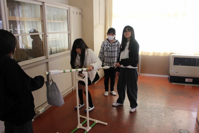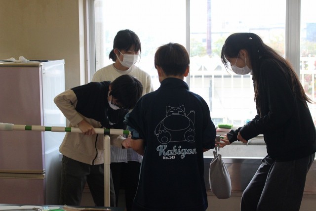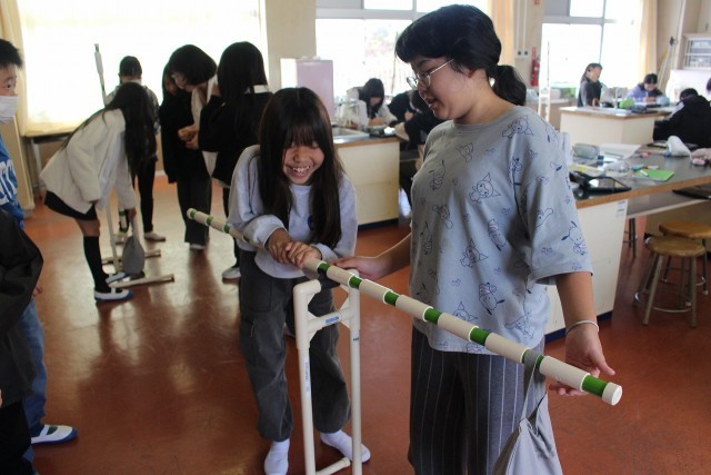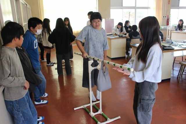 理科の時間に、大型の実験器具を使って、てこの学習をしました。おもりを置く場所や力を加える場所を変えながら、おもりを軽く持ち上げられる場所をさがしました。班ごとに実際に体験した感覚を話し合いました。次からは今日の学びを生かしてきまりを見つけていく学習になります。どんな決まりが見つかるか楽しみです。