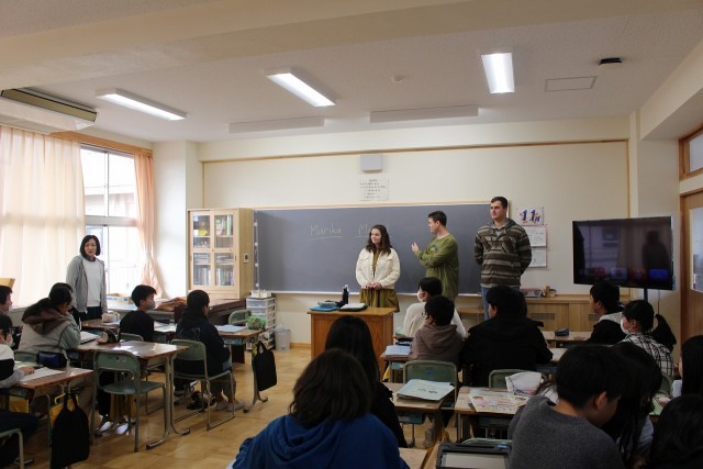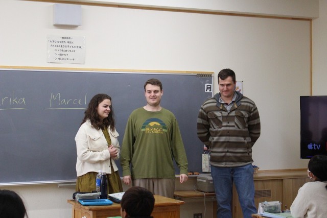 今日は、AETのニック先生のお兄さんと妹さんがゲストティチャーとして、5.6年生の英語の時間に参加してくださいました。子供達とは、授業の合間に質問をしてもらい交流しました。お兄さんはアメリカでパイロットをしていて、妹さんは飛び級で大学を卒業して警察署で働いているそうです。お兄さんは身長が203センチメートルあり、ニック先生よりもさらに身長が高かったので、子供達は驚いていました。