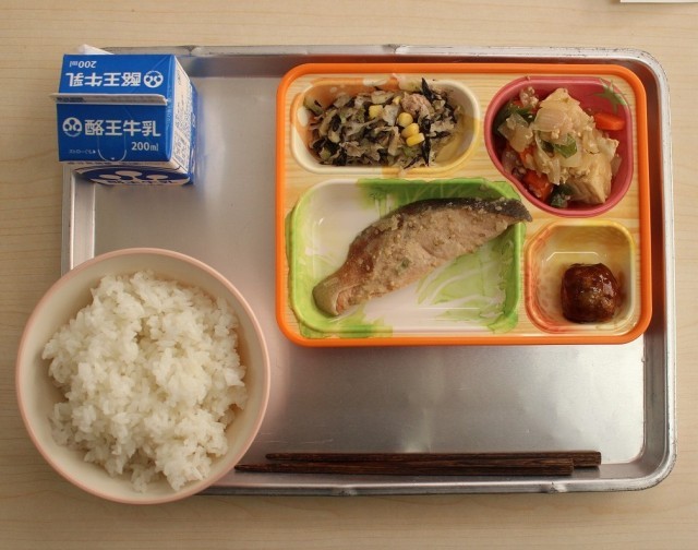 今日のお弁当のメニューは、あさか舞ごはん、牛乳、鮭のさんみ焼き、あつあげのそぼろ煮、ひじきサラダ、ミートボールでした。