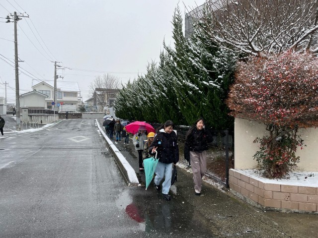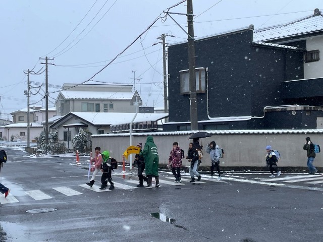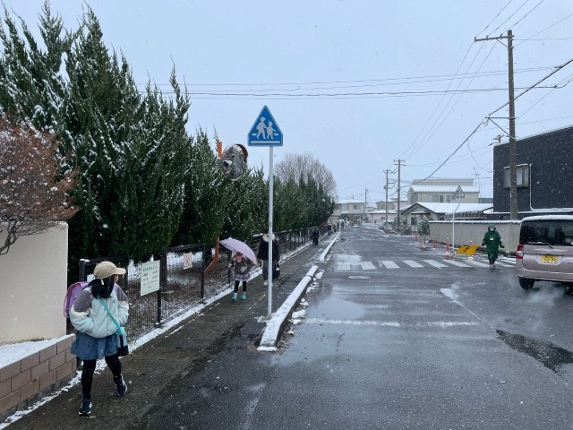 今日の朝は、明け方から降り出した雪が道路に少し積もり寒い朝になりました。それでも子供達は元気に登校してきました。厚手のジャケットや長靴、手袋、マフラー、毛糸の帽子等、すっかり服装も冬仕様になりました。今後も暖かい服装をして登校しましょう。