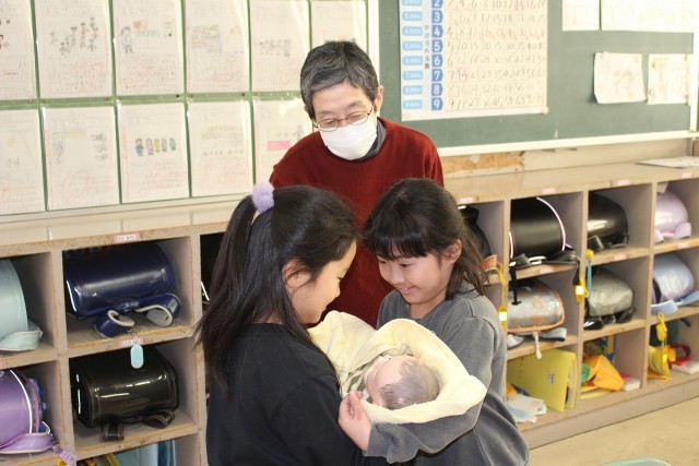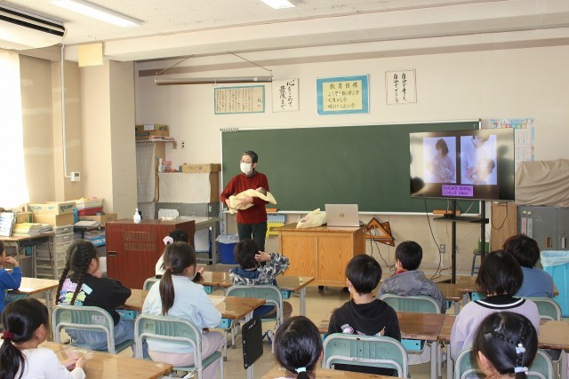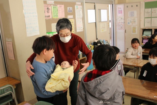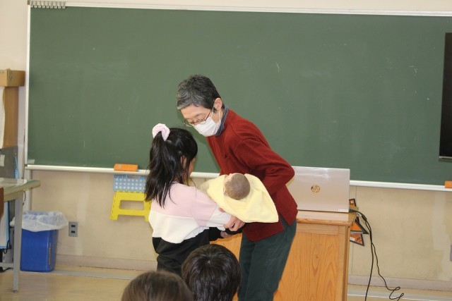 今日は助産師さんの吉岡先生に、これまでのわたしを振り返ったり、これからのわたしを考えたりするお話を聞きました。これまでのわたしでは、実際の赤ちゃんと同じぐらいの大きさと重さの人形をだっこする体験もありました。子供達は、吉岡先生の話に真剣に聞き入っていました。