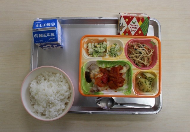 2学期の最後のお弁当給食メニューは、あさか舞ご飯、牛乳、鶏のトマトソースかけ、和風スパゲッティー、ブロッコリーのシーザーサラダ、青のりポテト、ミニケーキのクリスマスメニューでした。おいしくいただきました。