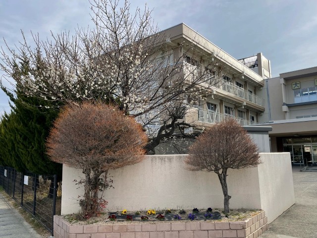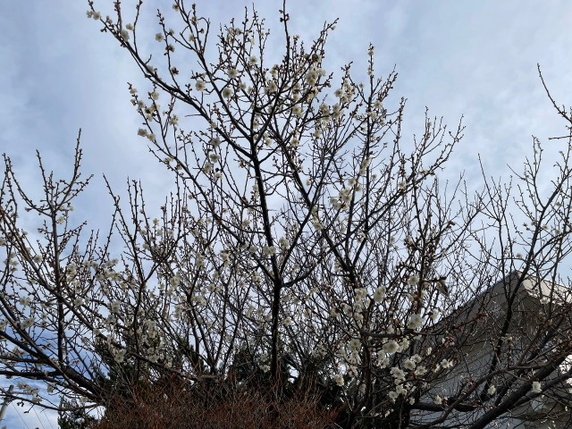 校門のところにある梅の木の花がきれいに咲きはじめました。