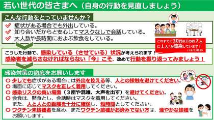 福島県より「若い世代の皆さまへの感染拡大防止のためのお願い」が出されました。新型コロナウイルス感染者数は高止まりの状況です。引き続き感染拡大防止対策のご協力をお願いいたします。