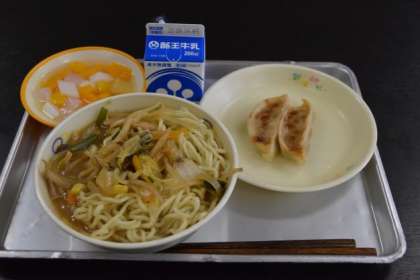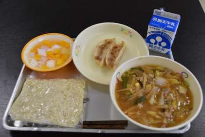 今日の献立は、みそタンメン、中華麺、牛乳、蒸し餃子、フルーツ杏仁です。みそタンメンは具だくさんで、とてもおいしい味です。