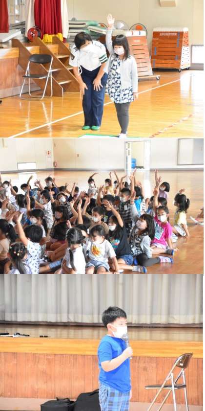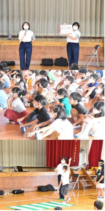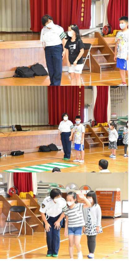 交通安全教室を行いました。1・2年生は、歩道や横断歩道の歩き方、飛び出さないことなどを学びました。