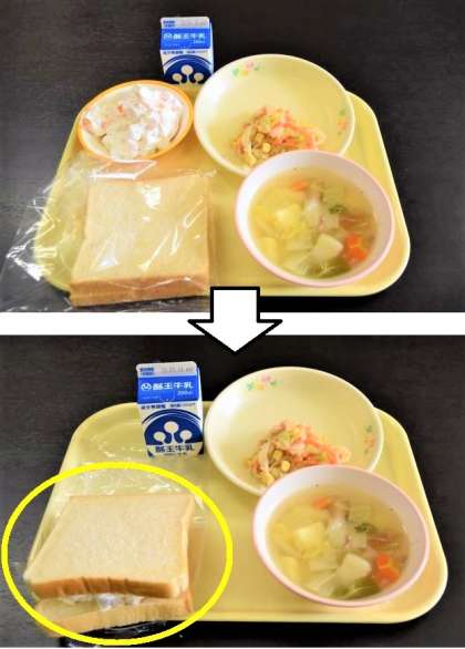 今日の献立は、フルーツクリームサンド、牛乳、ツナサラダ、野菜スープ、食パンです。