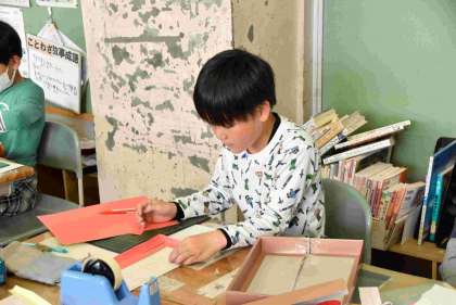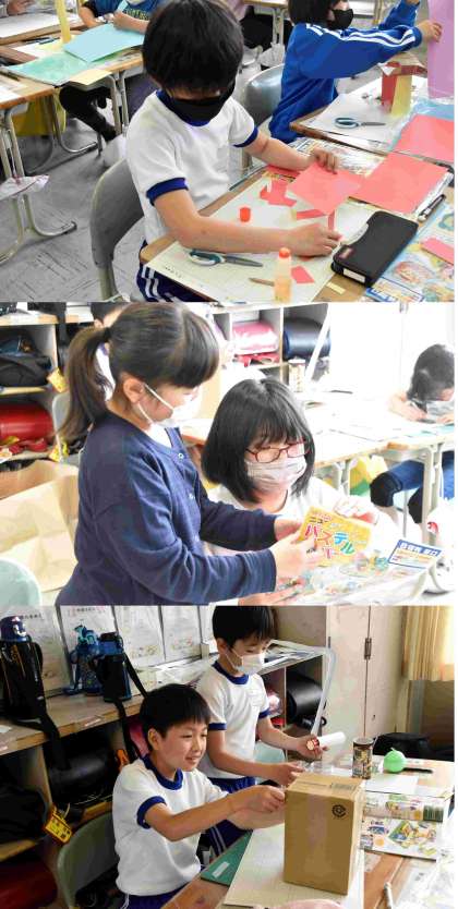 4年生は、カラフルな紙や箱を組み合わせて作品作りをしています。どんな作品が完成するか楽しみです。