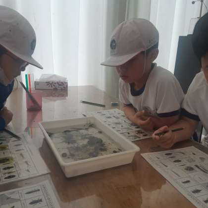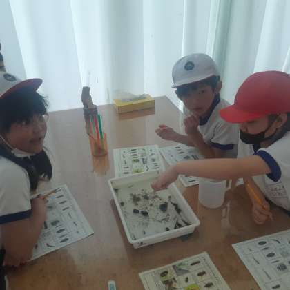どんな生き物がいたかな?捕まえた生き物をみんなで確かめています。