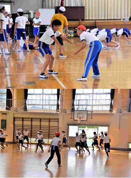 6年生は、体育館で暑さ対策をしながら体育科の授業です。6年生のなんと元気なこと! 6年生のみなさん、あなたたちはすごい!! 熱中症対策をしながら楽しく活動してください!