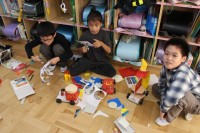 図画工作科の時間に、ゴムの力で走る夢の乗り物を作りました。子供たちは想像を膨らま...