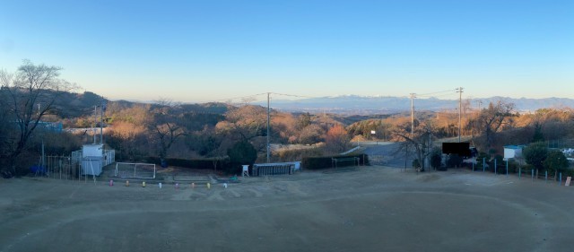 あまりの寒さに体がちぢこまって、ついつい目線が下を向いてしまう・・・そんな朝でしたが、ふと、遠くに目をやると、なんともすばらしい眺めが!! 澄んだ空気で、遠くの山々がくっきりと見え、近くの山とのコントラストがほんとうに見事でした。この景色は、海老根ならではです。