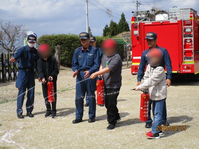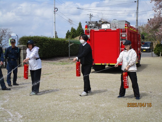 その後、教職員と子どもたち全員で消火器の使い方を体験しました。