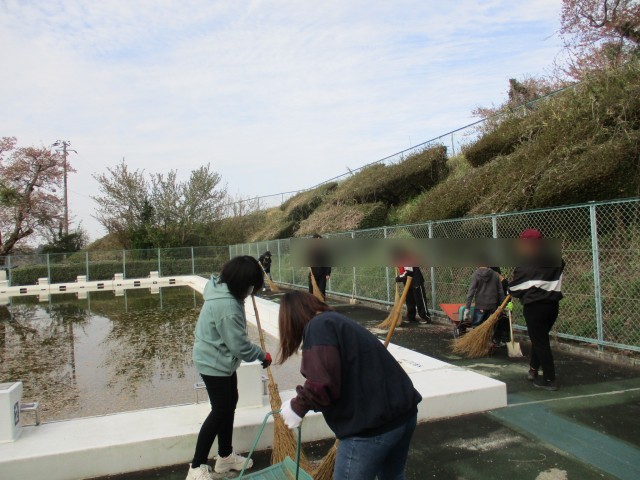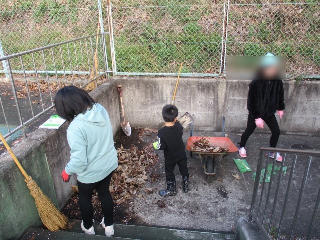 今回は親子での参加ということで、PTA会員の皆さまだけでなく、子どもたちも一緒に活動しました。さらに、卒業生やPTAのOBの方にもご協力いただき、大変心強い取り組みとなりました。作業内容は、プールサイドの落ち葉はき、校舎裏の側溝掃除、そして落ち葉集めなどです。約1時間という限られた時間でしたが、皆さんが集中して効率よく取り組んでくださったおかげで、みるみるうちにきれいになっていきました。
