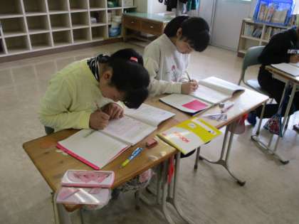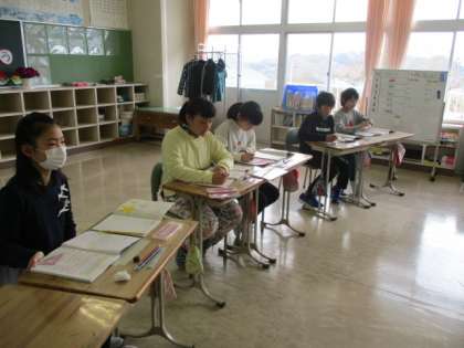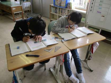 6年生の算数の授業のようすです。対称な形の学習をしていました。子どもたちは、線対称な形について詳しく調べていました。