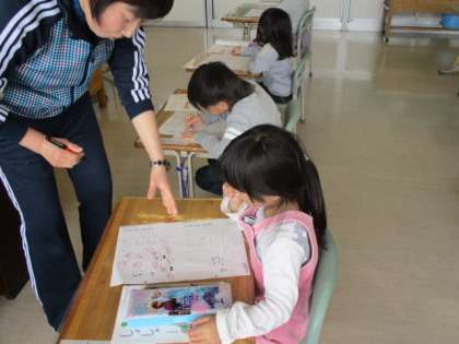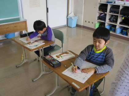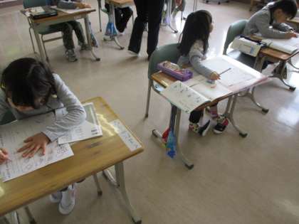 1・2年生の書写の授業のようすです。鉛筆の持ち方や姿勢に気をつけながら、いろいろな線や名前などを丁寧に書いていました。