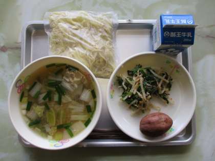今日のこんだては、みそラーメン、牛乳、ふかし芋、ほうれん草のナムルでした。