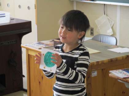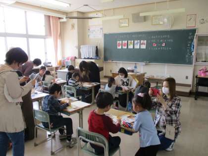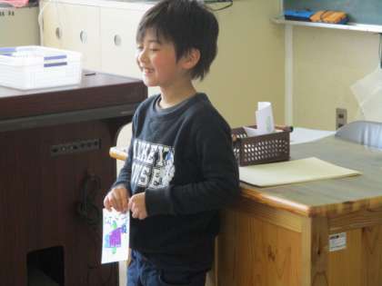 1・2年生の授業参観のようすです。図工の学習をしていました。子どもたちは、自分の好きなものからマークを作り、みんなに見せながら自己紹介していました。