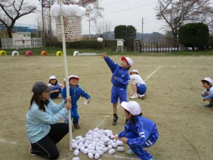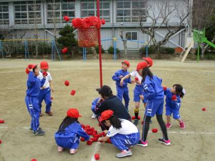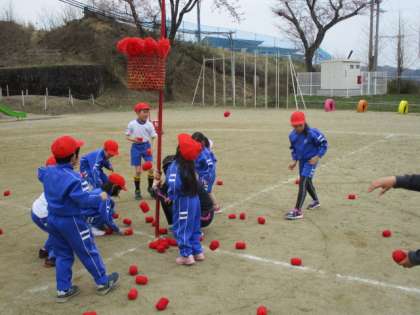 1〜4年生の運動会の練習のようすです。玉入れの練習をしていました。子どもたちは、並び方や順序などについて確かめながら、練習していました。