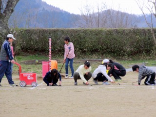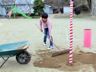 まずは遊具を固定し、次に入場門を設置しました。その後には、校庭をならしたり、草をむしったりと、明日の運動会が成功するように、5・6年生が協力して活動しました。