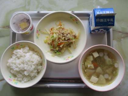今日のこんだては、麦ごはん、牛乳、納豆、焼豚と春雨のあえもの、けんちん汁でした。