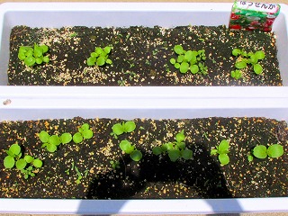 1年生が大切に育てているホウセンカ。現在、日当たりのよい職員室前に置いてあります。ホウセンカは、あっという間に芽を出し、ぐんぐん生長しています!