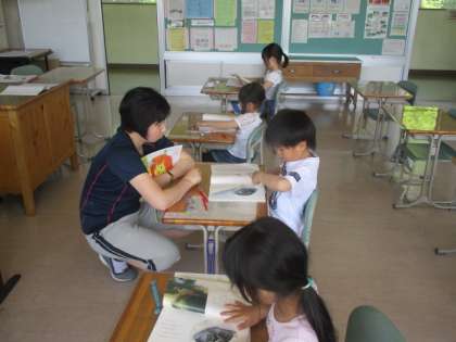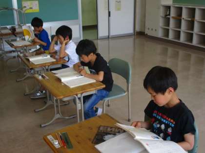 1・2年生の国語の授業のようすです。1年生も2年生も教科書の文を読む学習をしていました。1年生は、お手本の読みを聞いてから、2年生は正確に読めるように練習をしていました。