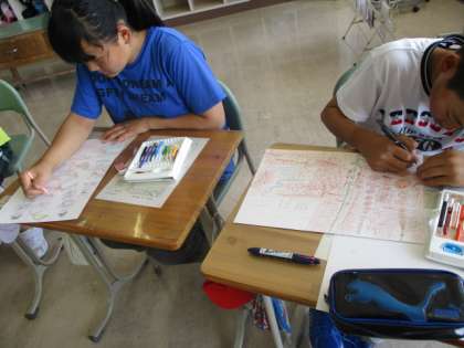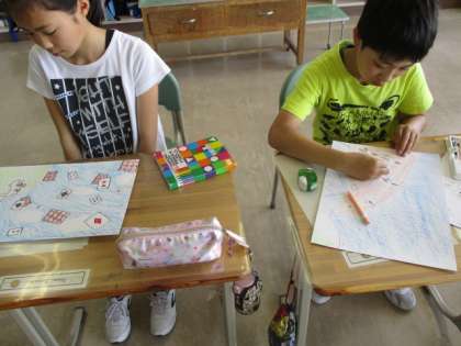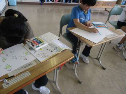 5・6年生の図工の授業のようすです。昨日描き始めた作品を仕上げていました。子どもたちは、色を丁寧に塗り、各自のアイディアを表現したようです。