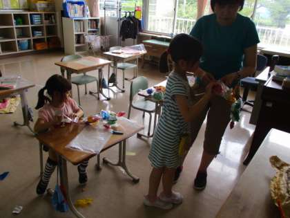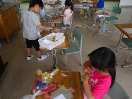 1年生の図工の授業のようすです。子どもたちは、透明の袋にカラーセロイハンを詰め、飾りをつけて、作品にしていました。