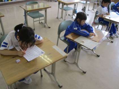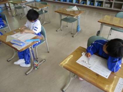 1年生の算数の授業のようすです。たし算のまとめをしていました。子どもたちは、いろいろな問題に取り組んでいました。