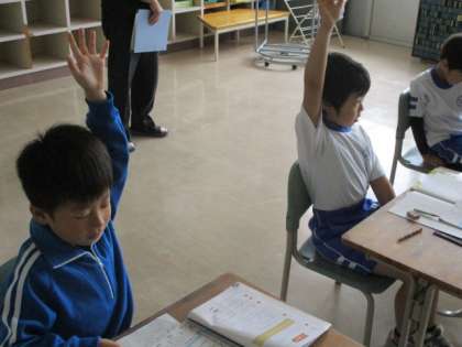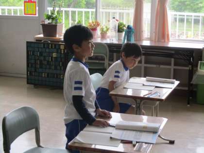 2年生の算数の授業のようすです。長さの学習のまとめをしていました。子どもたちは、教科書の問題を解いて、みんなで答えを確かめていました。