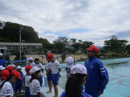 今日の海老根っ子タイムにプール開きを行いました。子どもたちに、「目標を決めて取り組むこと」「約束と教師の指示を守って安全に取り組むこと」を話しました。その後、各学年の代表が、目標を発表しました。最後に体育主任から注意事項について話してもらいました。