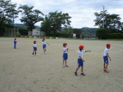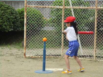 3・4年生の体育の授業のようすです。校庭でティーボールをしていました。ホームランを打って喜んでいる子、アウトになってくやしがる子など、様々でした。