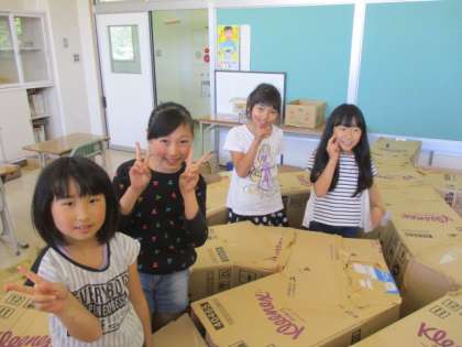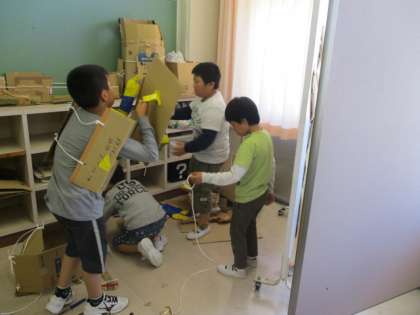 3・4年生の図工の授業のようすです。だんだんだんボールの作品が完成しました。