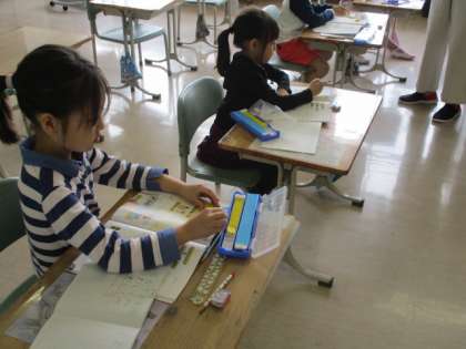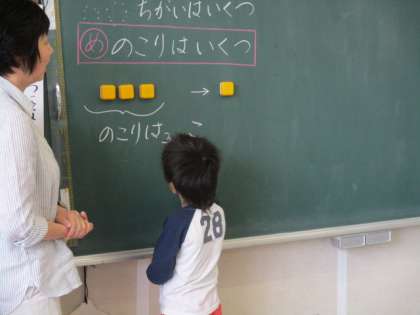 1年生の算数の授業のようすです。ひき算の学習をしていました。子どもたちは、ブロックを上手に使って、答えを出していました。